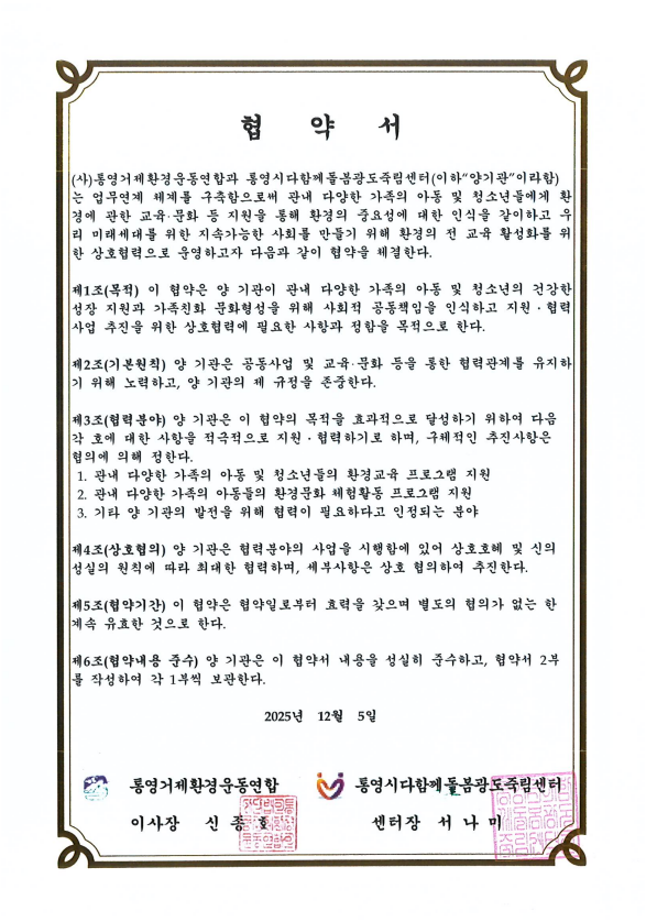 아동 및 청소년대상 환경교육을 위해 죽림다함께돌봄센터와 업무협약을 맺었습니다.